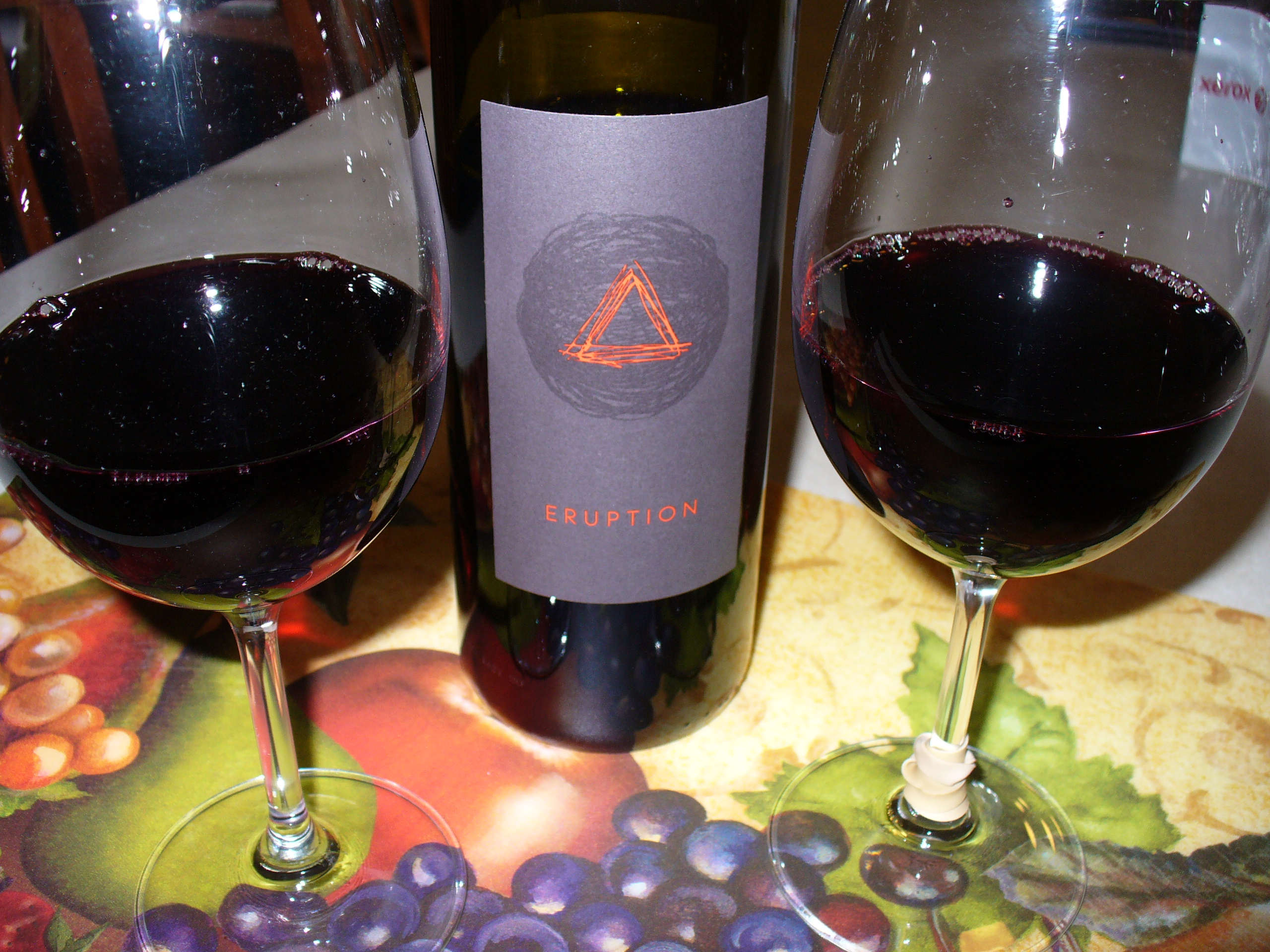 We are a bit wary of wines with wacky or funny labels but we were enticed by a promotional sale at our local wine shop to try a red blend called Eruption. The label indicates that it is a 2012 proprietary red wine from Volcano Ridge Vineyard in the High Valley Appellation offered by Brassfield Estate Winery. The varietals are not indicated on the label so we take the opportunity to taste and guess.