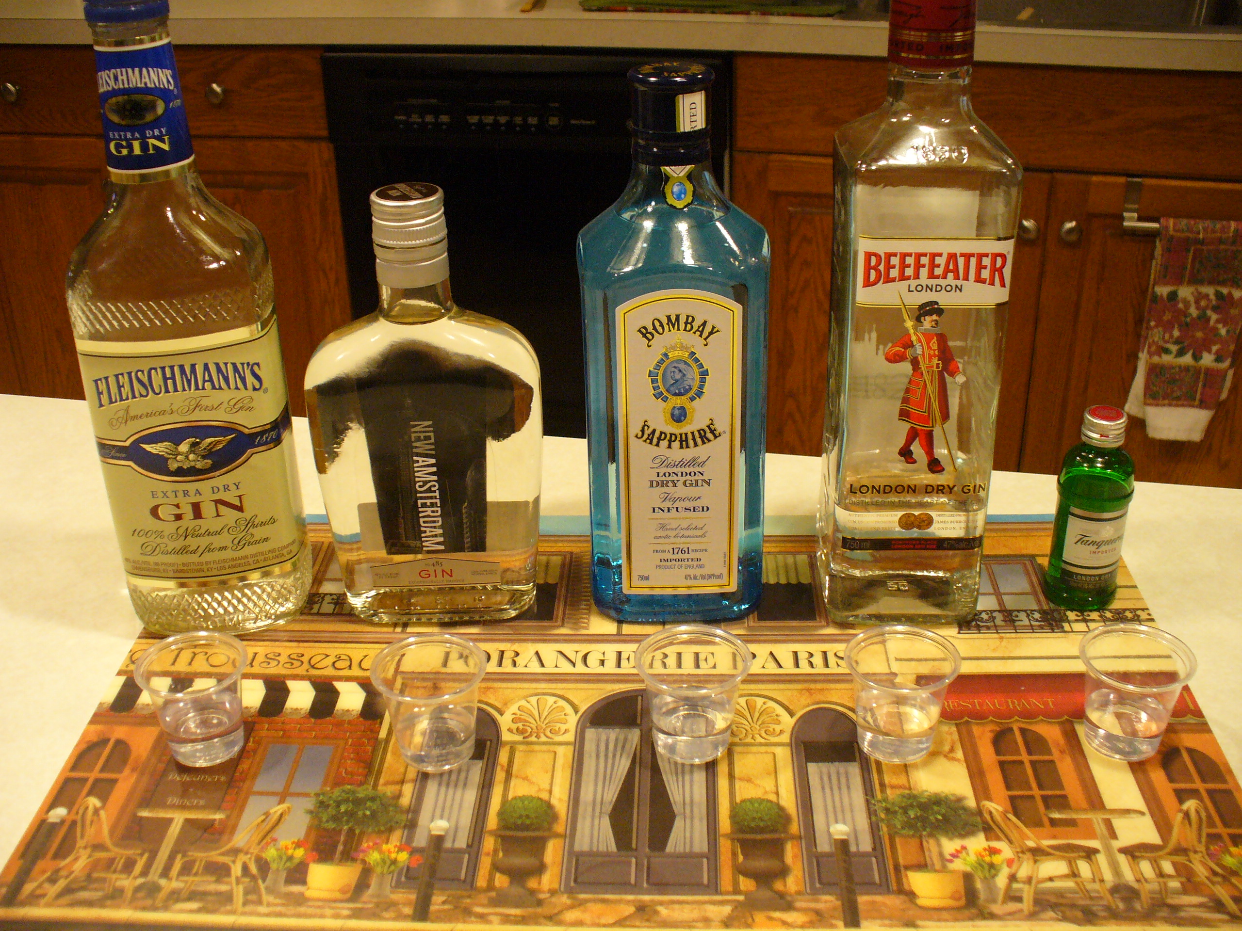 We don’t typically drink gin, so part one of this drink lab is to taste several different gins side-by-side. We are sampling Tanqueray, Beefeater, Bombay Sapphire, Amsterdam, and Fleischmann’s.