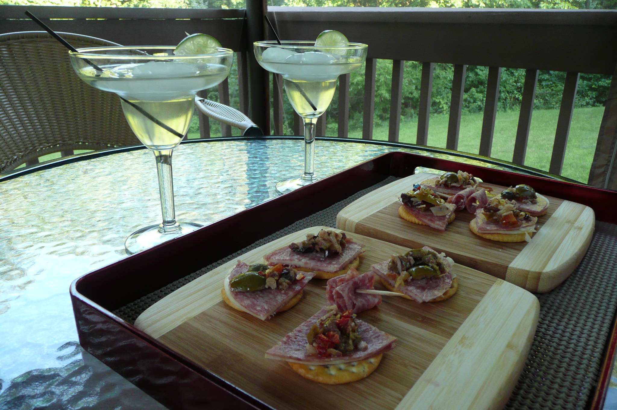 We pair our full-sized Don Julio Anejo margaritas with muffuletta crackers. The muffuletta is a popular New Orleans sandwich made with salami, mortadella, provolone cheese, and olive salad on a round sesame roll. For muffuletta crackers, layer the meat and cheese Oreo-style; a slice of provolone sandwiched between two slices of salami. Cut into quarters, place on crackers and top with a spoonful of muffuletta olive salad. Cocktail hour is good to go!
