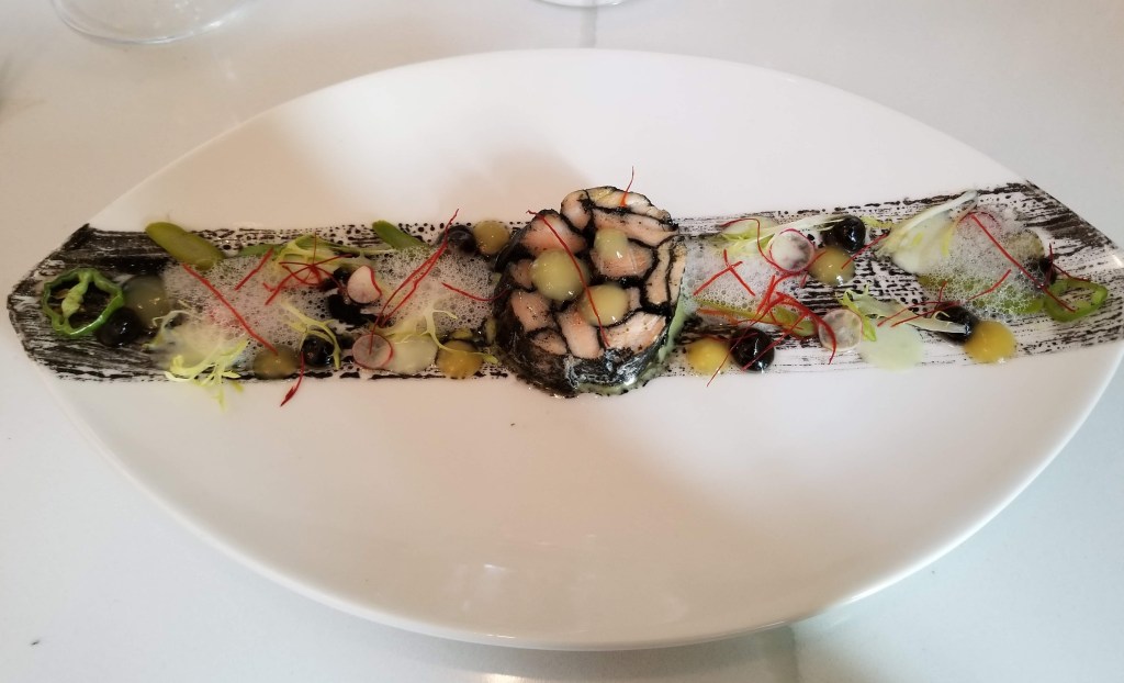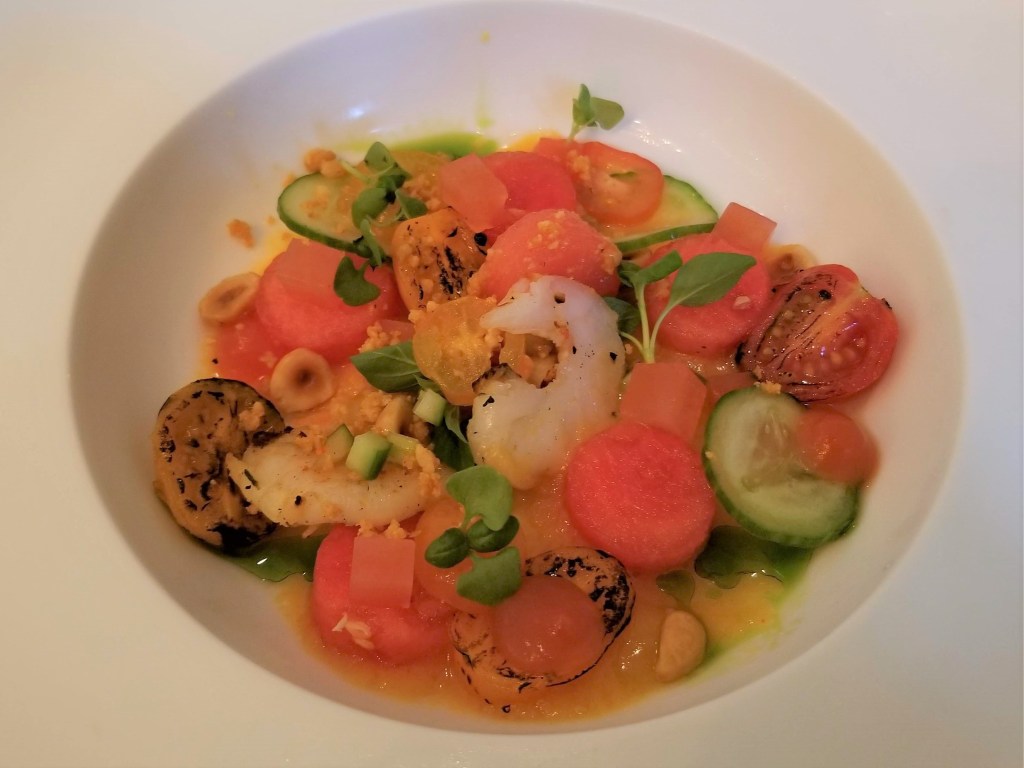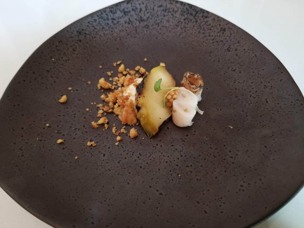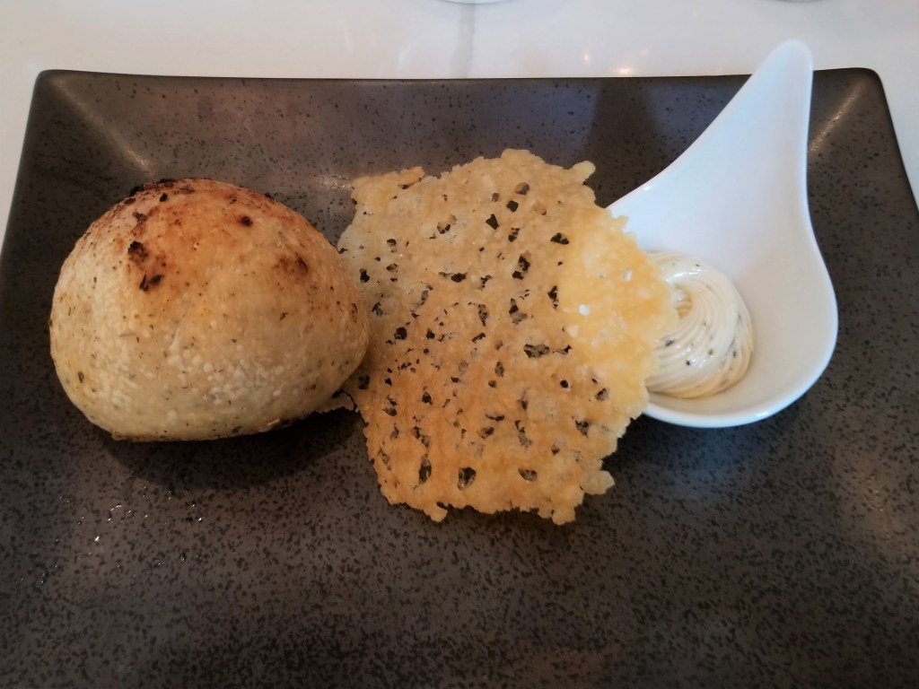Provence is located in a beautifully renovated 1854 historic mansion that also serves as a bed and breakfast hotel. The restaurant on the first floor takes up several rooms connected by large entryways. Their tasting menu, which changes monthly, consists of five courses. Additional courses may be added at the chef’s discretion, in our case, an amuse bouche (a bite-sized hors d’oeuvre) and a bread course including a piping hot rosemary roll, compound butter, and a fried parmesan cheese crisp. I had decided before going to Provence that no matter what food was put in front of me, I would push myself to be adventurous enough to try it.