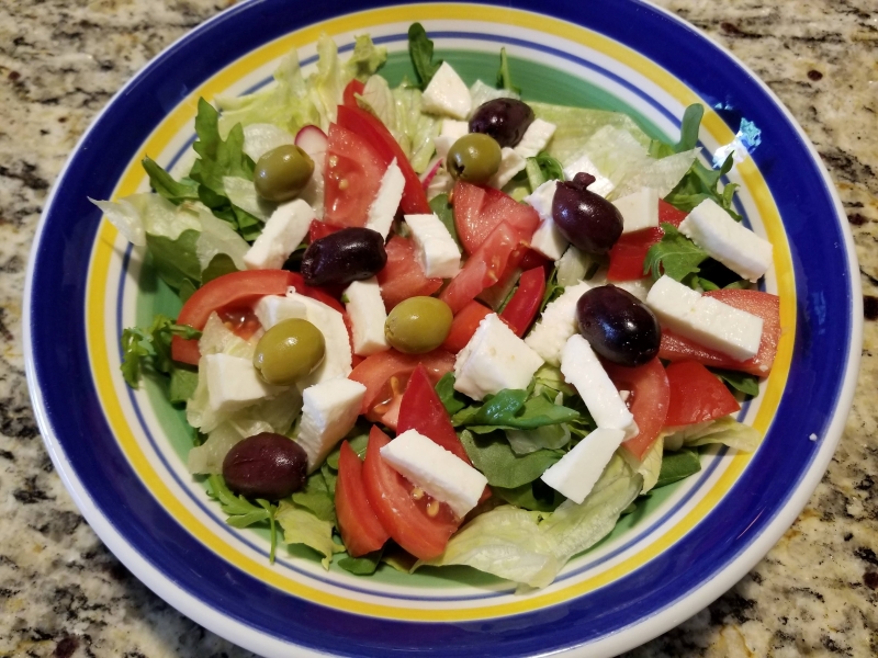 Our first meal is a garden salad combining a handful of arugula with iceberg lettuce. We’re still getting local Jersey tomatoes from the farm stand, and I’ve been stocking fresh mozzarella to go with the tomatoes. The rest of the salad consists of radishes, green and kalamata olives, and fresh-picked parsley from my herb garden. I’ve been on a Thousand Island dressing kick lately but Italian or a plain vinaigrette will work just as well.